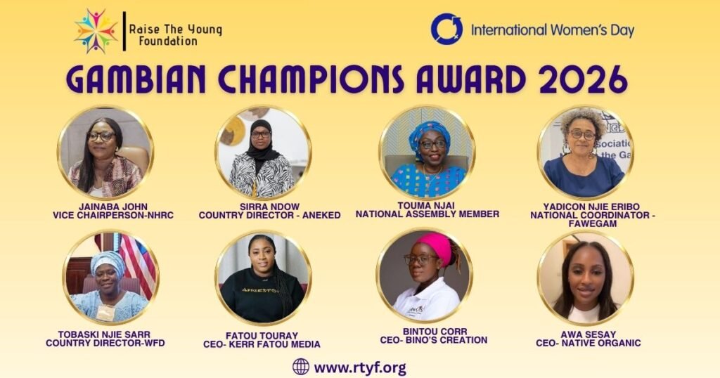 THE GAMBIAN WOMEN CHAMPIONS AWARD 2026 Celebrating Excellence in Honor of International Women’s Day 2026 In commemoration of the International Women’s Day 2026, Raise The Young Foundation (RTYF) is proud to officially unveil the list of distinguished nominees for the upcoming Women’s Championship Awards. The Gambian women champions awards seek to recognize and celebrate […]